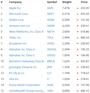Top 15 Stocks in the S&P 500 and their weighting on the Index– (as of December 17, 2024) |